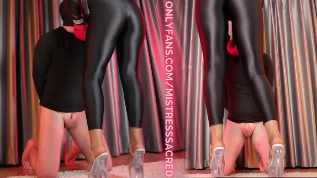Mistress Sacred stands tall in black stiletto heels, latex gloves up to her elbows, mask hiding part of her face — full dominatrix energy. The guy’s on his knees the whole time, head down, taking a light beating and sucking at her feet like he’s desperate for it. She holds a whip in some shots but doesn’t really use it hard — more for show, part of the power vibe. Camera stays tight, mostly side angles and close-ups, emphasizing the control and submission. Background’s a plain studio with curtains, so all attention stays on the foot worship and posturing. She’s blonde, mid-20s, slim with some visible tattoos, wearing all black. He’s clean-cut, slim, submissive, barely moving unless she directs him. A lot of the action is psychological — the humiliation, the waiting, the way he licks and presses his face into her soles. Not a lot of variation, but if you’re into strict female domination, foot fetish, and visual control, it’s nailed down right. No penetration, just power play, spit, and worship.