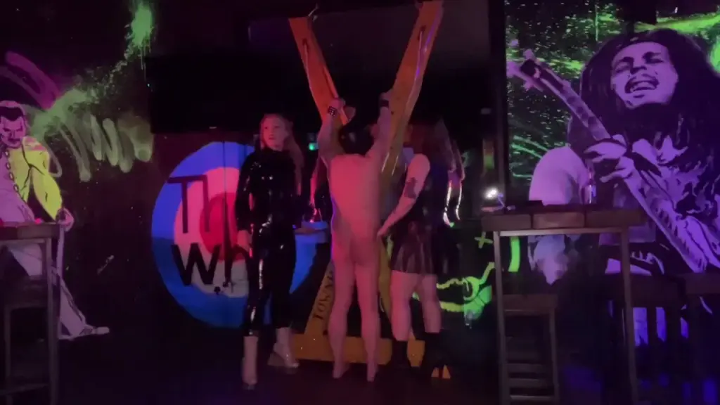The video opens with a wide shot of a bar lit in neon and black light, where four women and a young guy are posing together. One guy is lifted off the ground by the group, arms stretched under his back, held midair like some kind of frat party stunt. All four women are in their twenties — three with long dark hair, one with long blonde hair, all slim with no visible tattoos. They’re standing close, wearing casual party clothes, laughing, leaning into each other, looking like they’ve been out for a few drinks. The lighting gives everything that glow-in-the-dark party vibe — you see the outlines of tables, chairs, and bar fixtures in the background, but no interaction beyond the pose. The guy stays suspended for several frames, then the group shifts but stays together, still posing for the camera. No dancing, no touching beyond the lift, just a frozen group shot under dramatic club lighting. At one point the blonde steps slightly forward and turns for a close-up, facing the lens directly, arms at her sides, expression neutral. The rest of the women hang back in the wide shots, staying grouped near the guy. It’s not sexual — no grinding, no contact beyond the lift — just a late-night out scene with strong lighting and tight framing. The vibe is more social than suggestive, like a promo shot for a party video or influencer content. Camera holds steady throughout, no cuts or movement, just static wide and close-up shots. Background details are minimal but consistent — dark floors, neon trim, empty tables. Everyone looks comfortable, but there’s no escalation or variation in the action. The entire thing feels staged, part of a longer night, maybe the start or a break in something else. Last shot is the blonde alone, closer in, face and body fully visible, hair over one shoulder, still in the same outfit — black top, jeans, simple look. Nothing explicit happens. Just poses, lighting, and group energy.